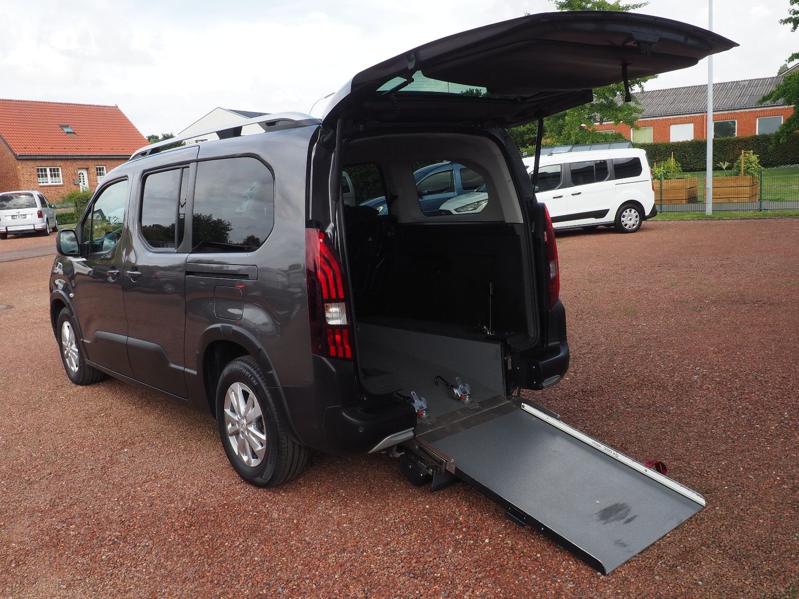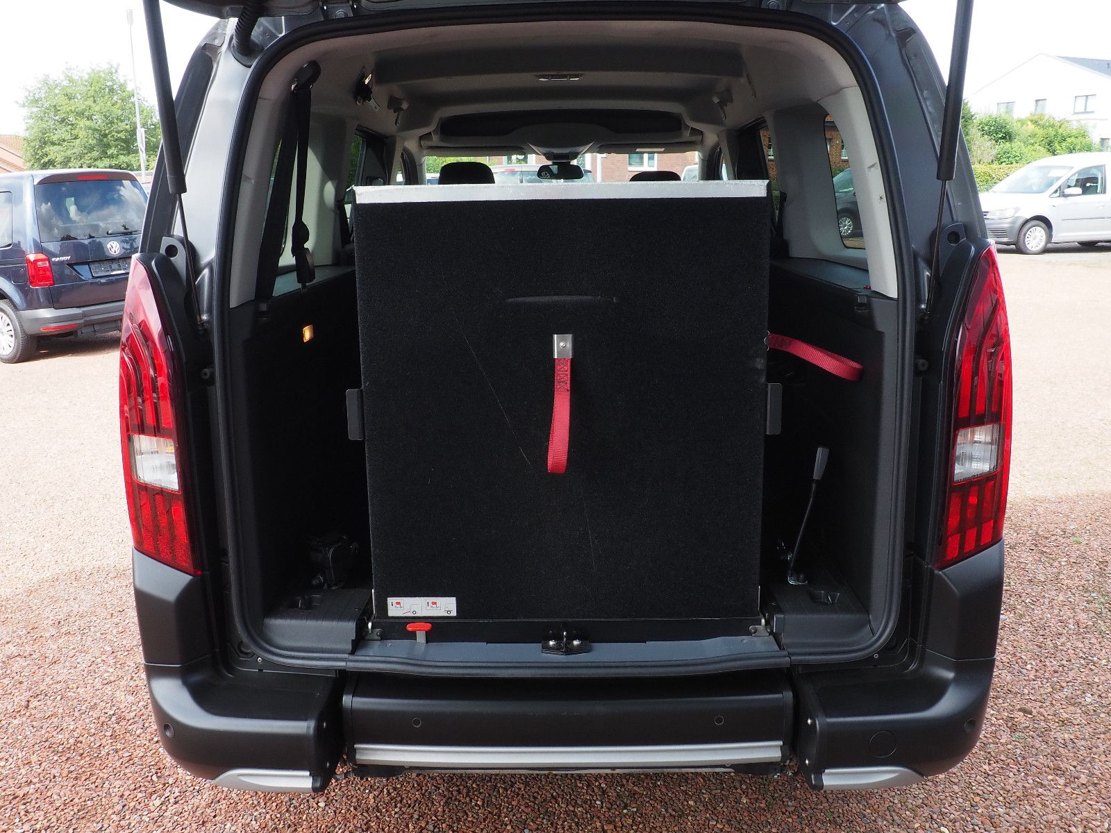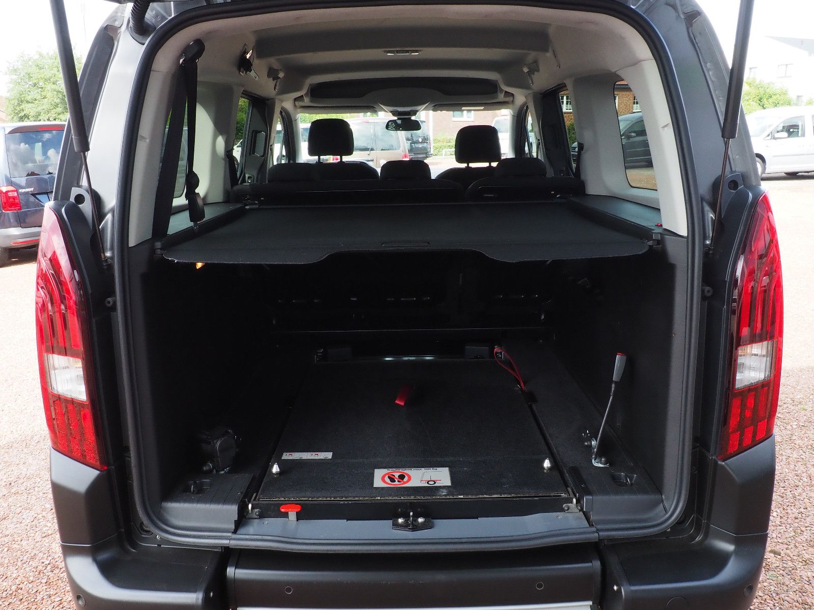 ( 113 ) Peugeot Rifter Allure Automatik L2, langer Radstand mit Heckausschnitt und klappbarer Rollstuhl/Wenderampe. AMF-Bruns Umbau. Die Rampe lässt sich bei Nichtgebrauch vollständig nach vorne umlegen so das wieder ein ebener Ladeboden entsteht. Der Rollstuhl wird mit 2 elektrischen Gurten vorne und 2 Spannretraktoren hinten ordnungsgemäß fixiert, zusätzlich wird die zu befördernde Person im Rollstuhl sitzend mit einem Schulter/Beckengurt gesichert. Bei Rollstuhltransport verbleiben 5 vollwertige Sitzplätze, kein umklappen der 2.Sitzreihe erforderlich, Einfahrbreite/Rampenbreite 77 cm, Einfahrhöhe 142 cm,