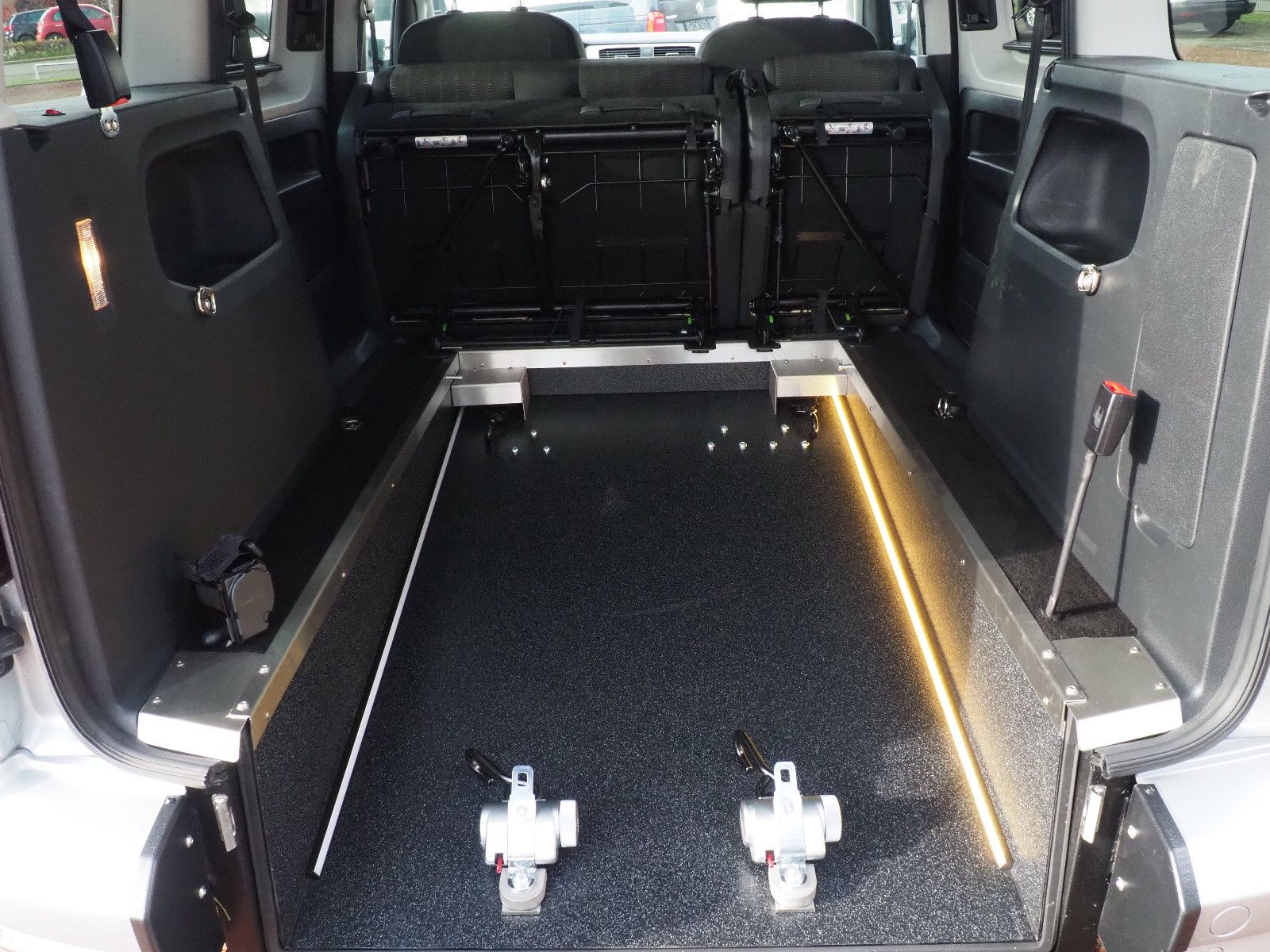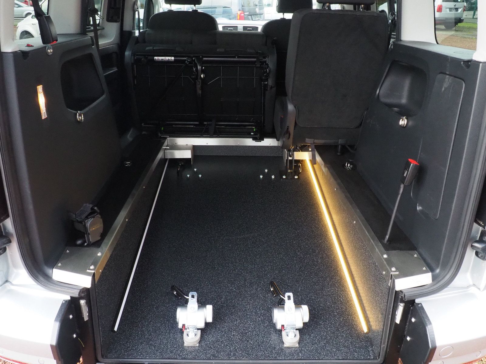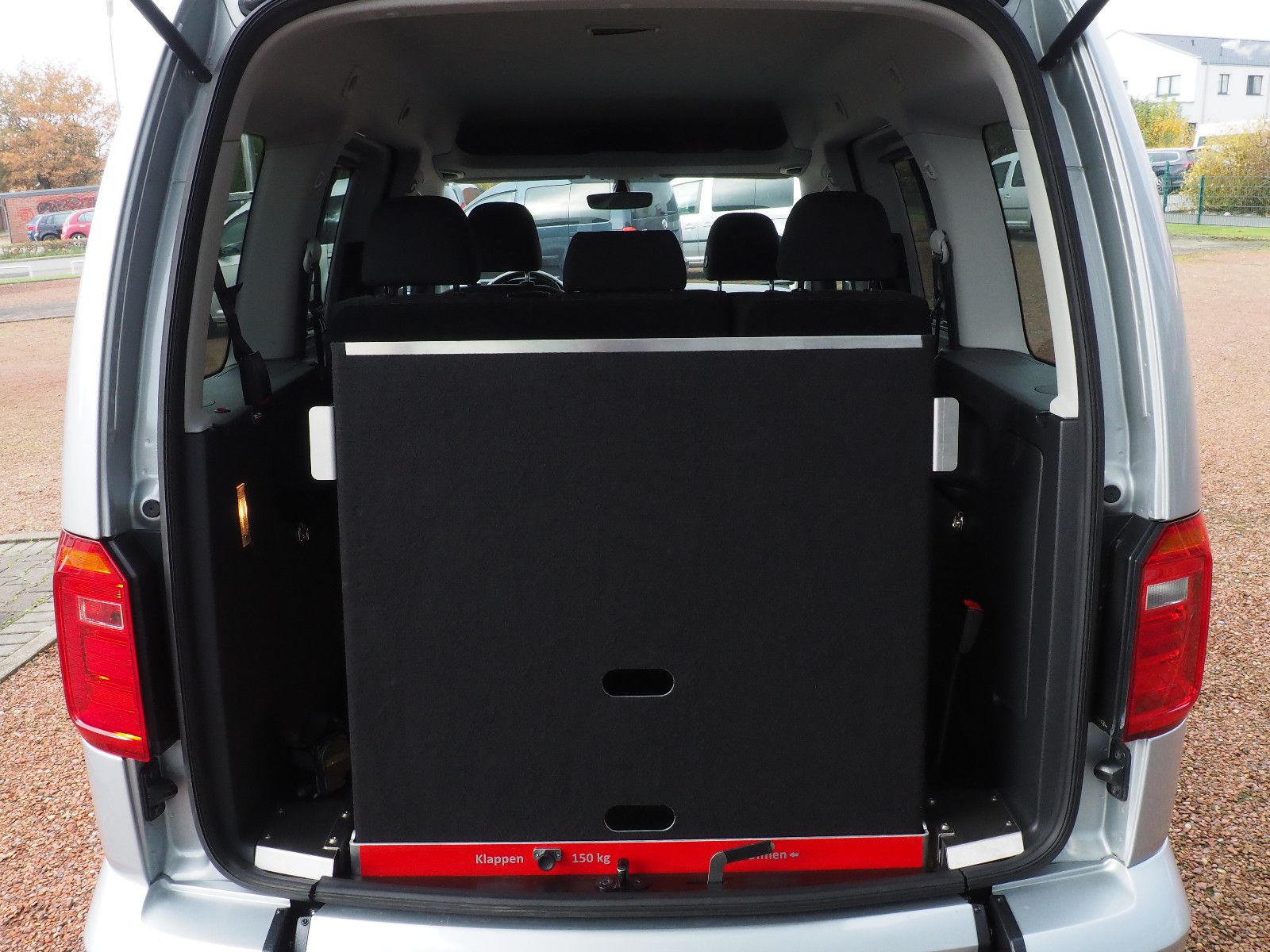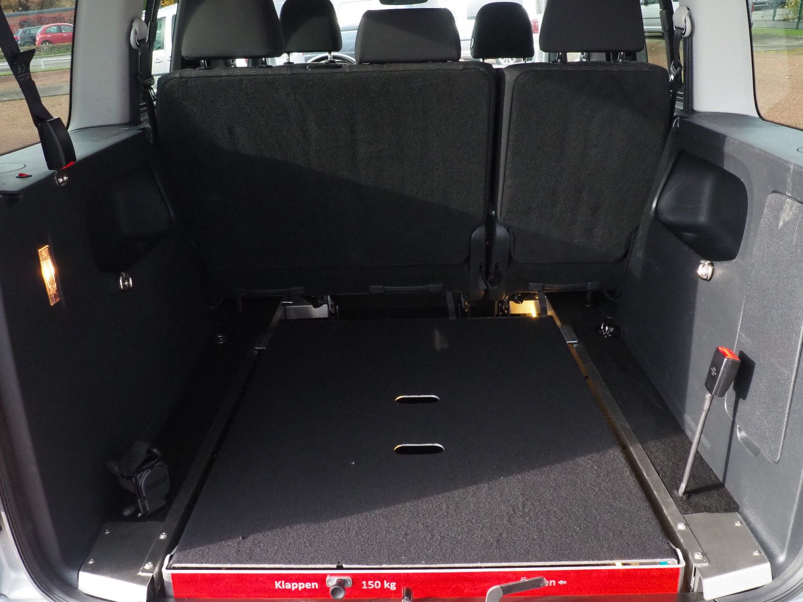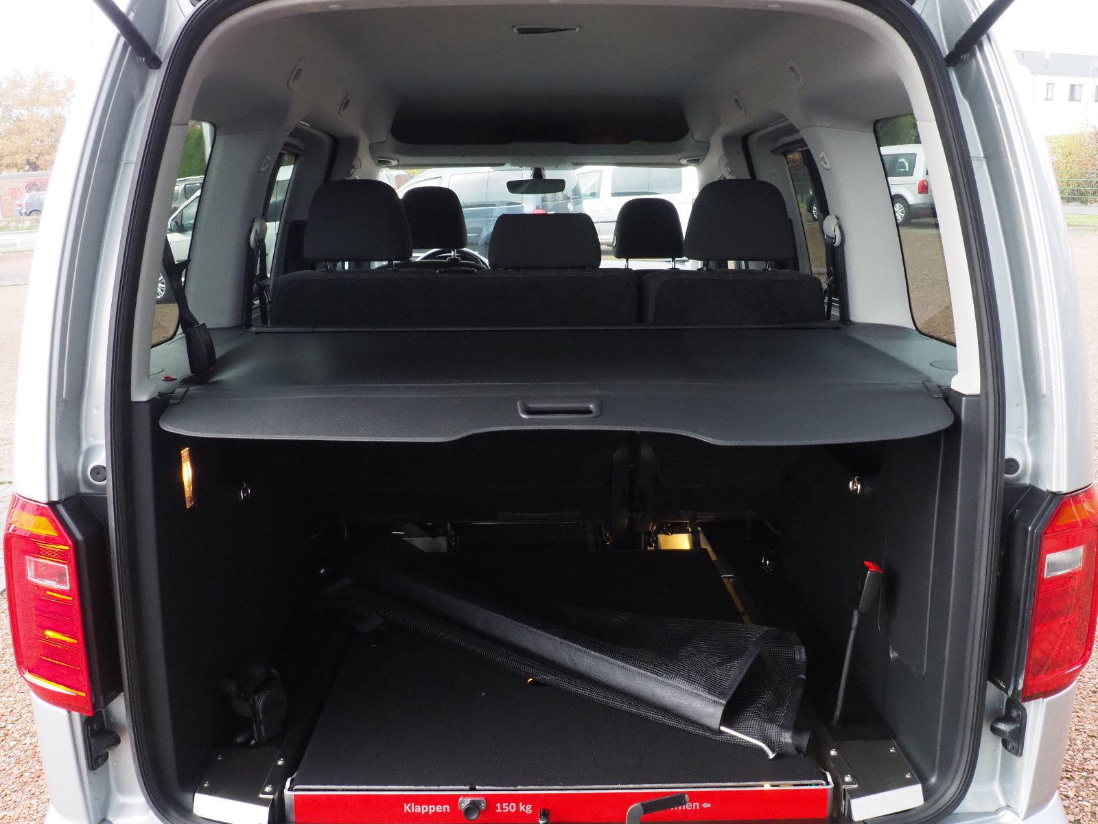 VW CADDY Comfortline TDI mit Heckausschnitt und mit einer nach vorn umlegbaren Rollstuhlrampe/Wenderampe! LED Bodenbeleuchtung! Die Rampe lässt sich bei Nichtgebrauch vollständig nach vorne umlegen so das wieder ein ebener Ladeboden entsteht.