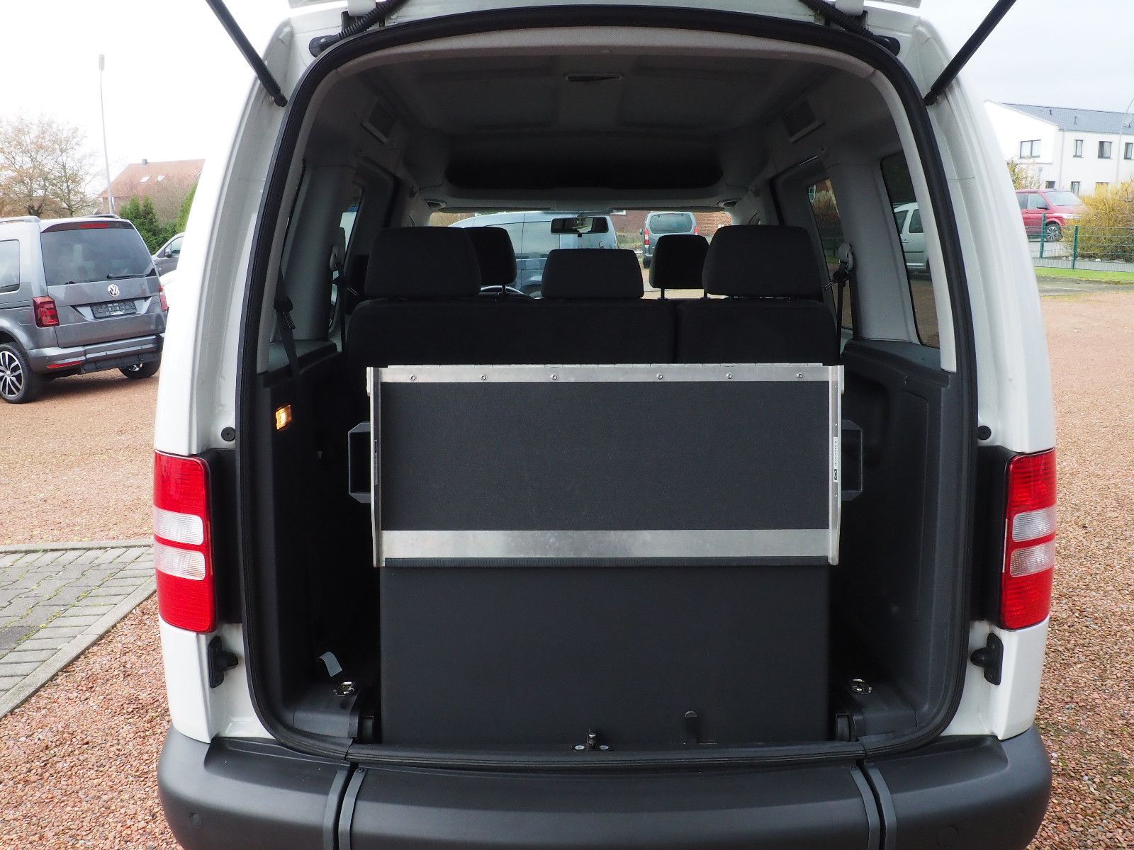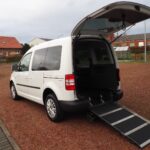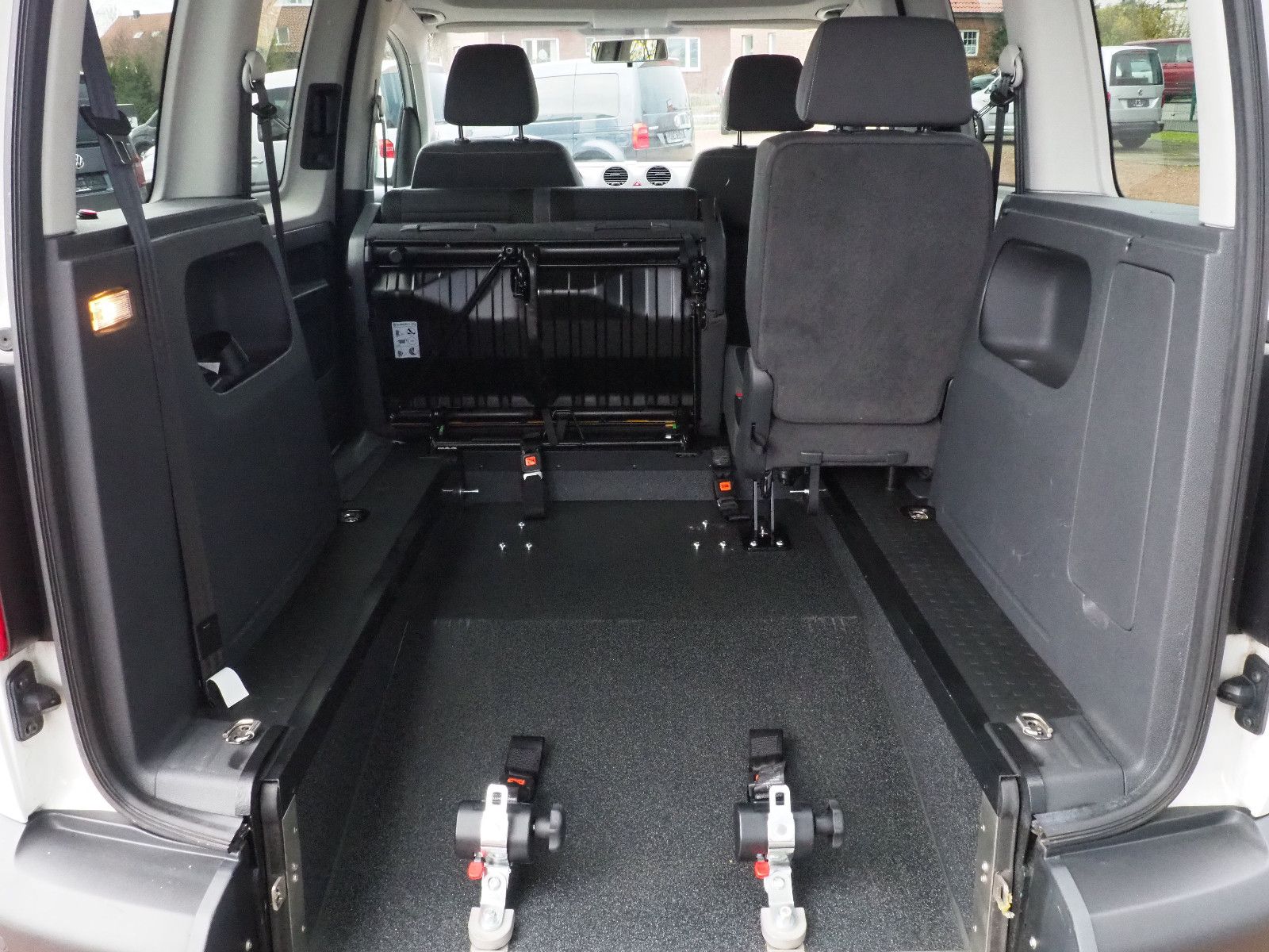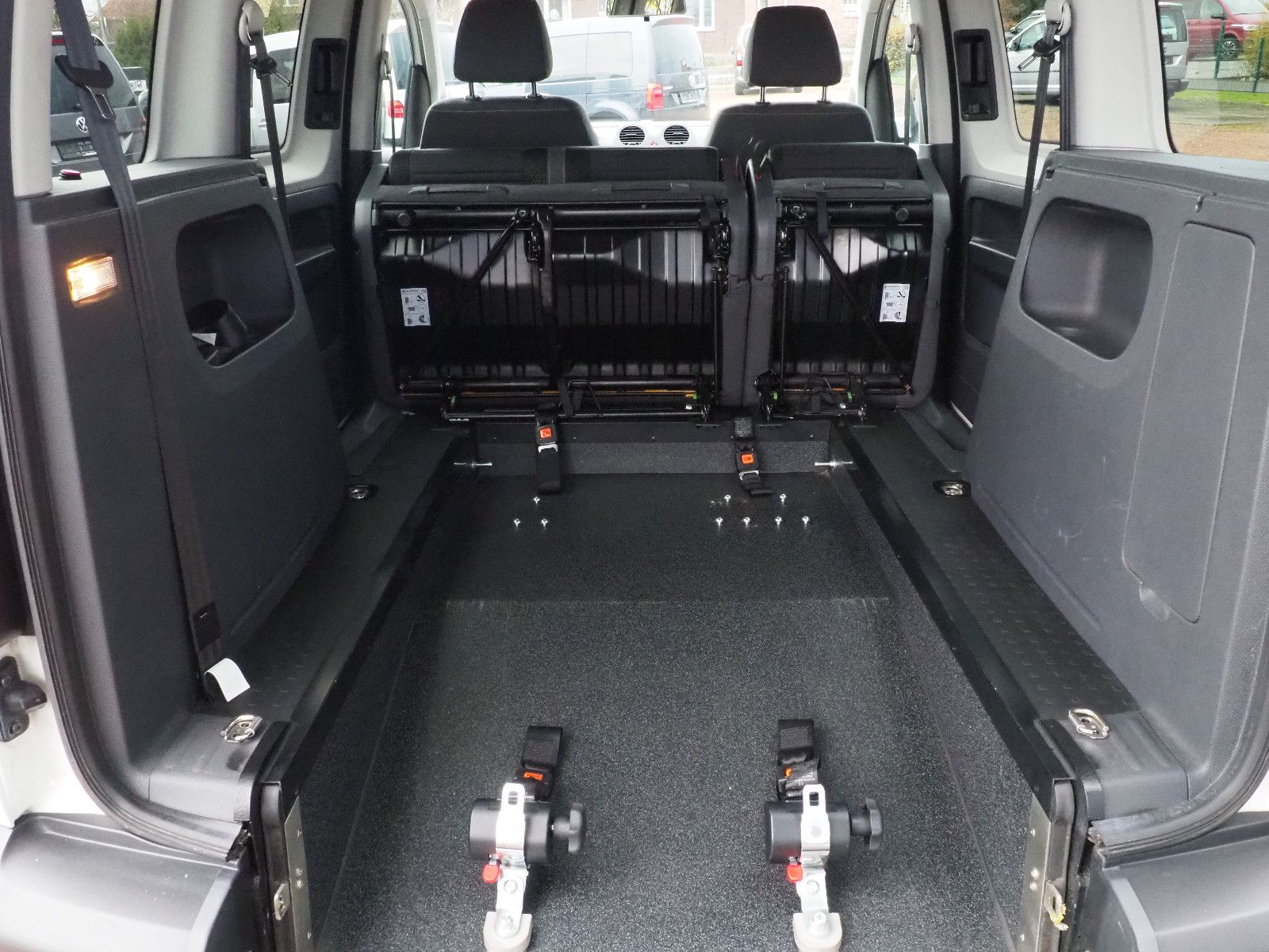VW Caddy Sondermodell Soccer, Rollstuhlgerecht, Heckausschnitt mit klappbarer Rollstuhlrampe. Der Rollstuhl wird mit 2 elektrischen Gurten vorne und 2 Spannretraktoren hinten ordnungsgemäß fixiert, zusätzlich wird die zu befördernde Person im Rollstuhl sitzend mit einem Schulter/Beckengurt gesichert.