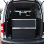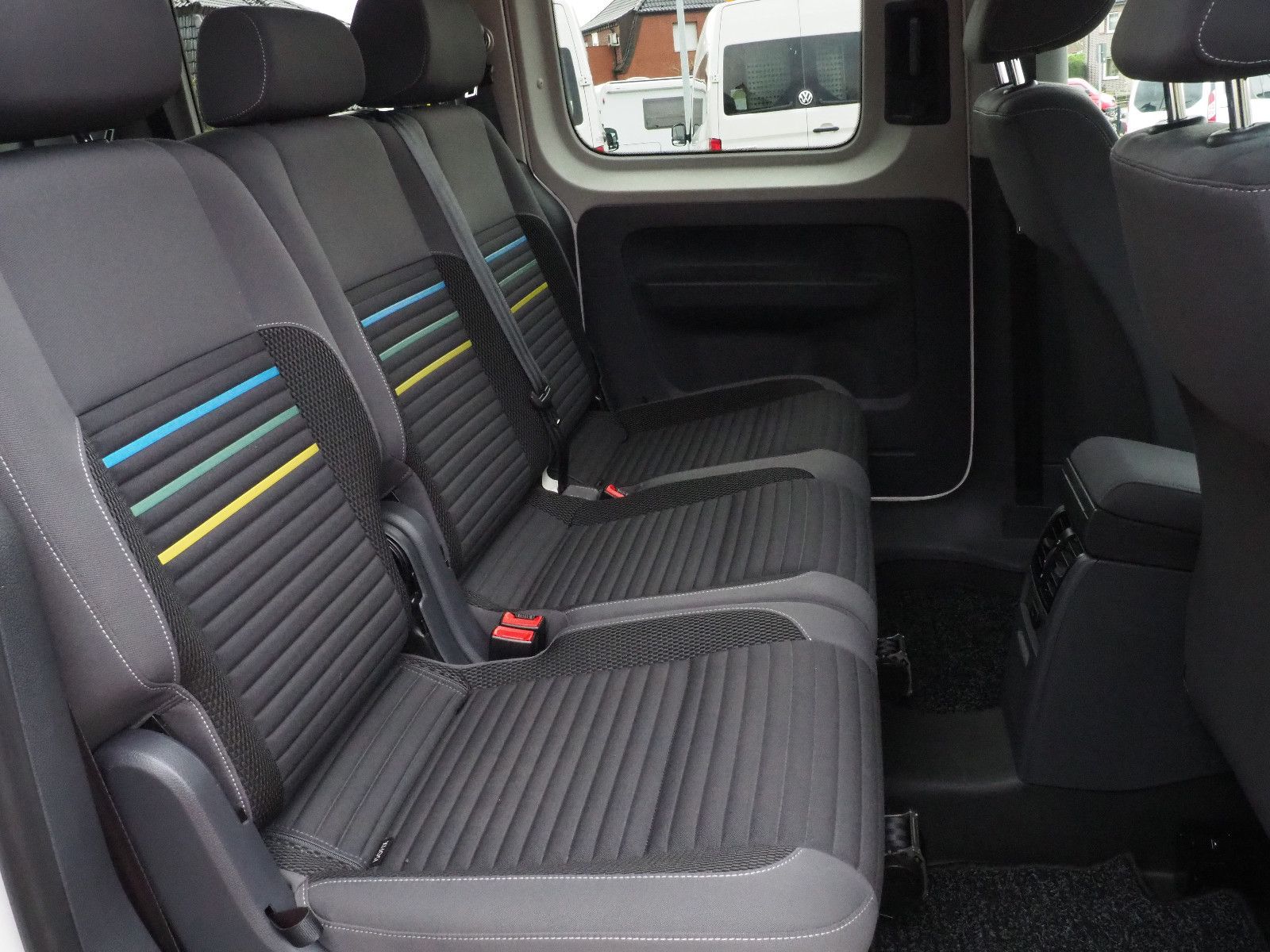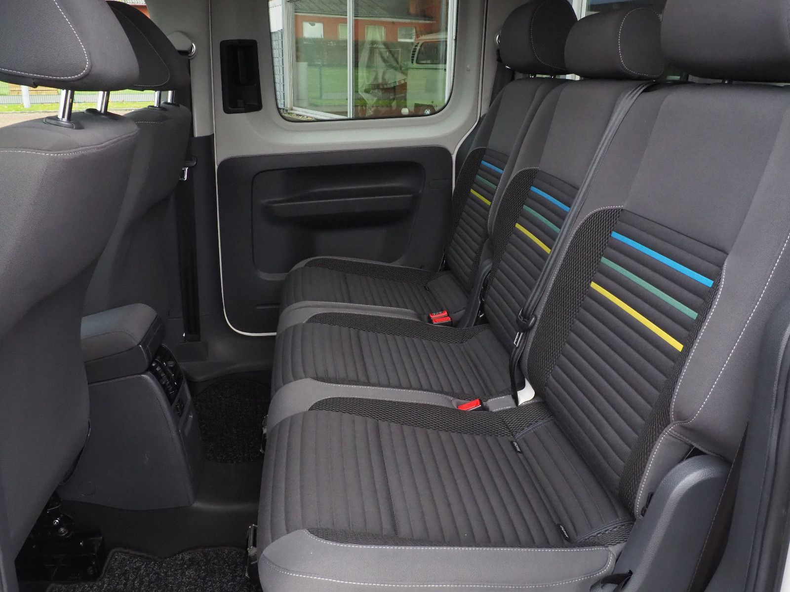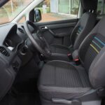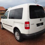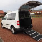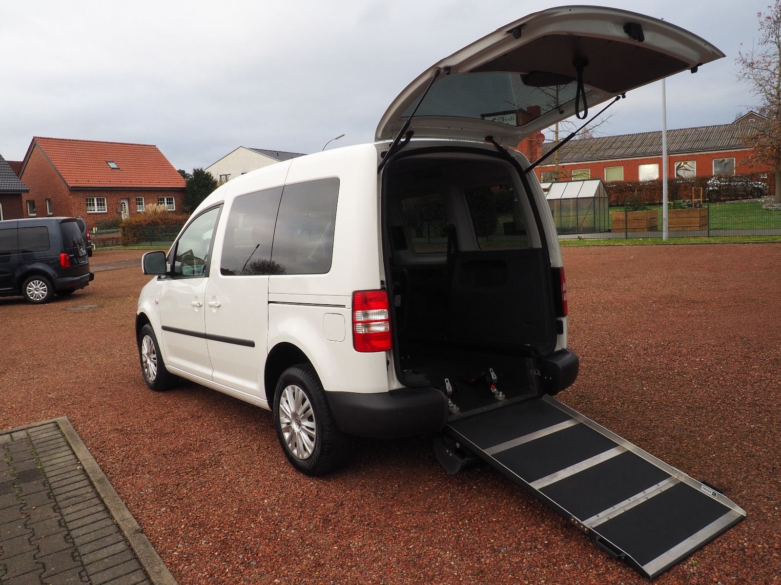 VW Caddy Sondermodell Soccer, Rollstuhlgerecht, Heckausschnitt mit klappbarer Rollstuhlrampe. Der Rollstuhl wird mit 2 elektrischen Gurten vorne und 2 Spannretraktoren hinten ordnungsgemäß fixiert, zusätzlich wird die zu befördernde Person im Rollstuhl sitzend mit einem Schulter/Beckengurt gesichert.