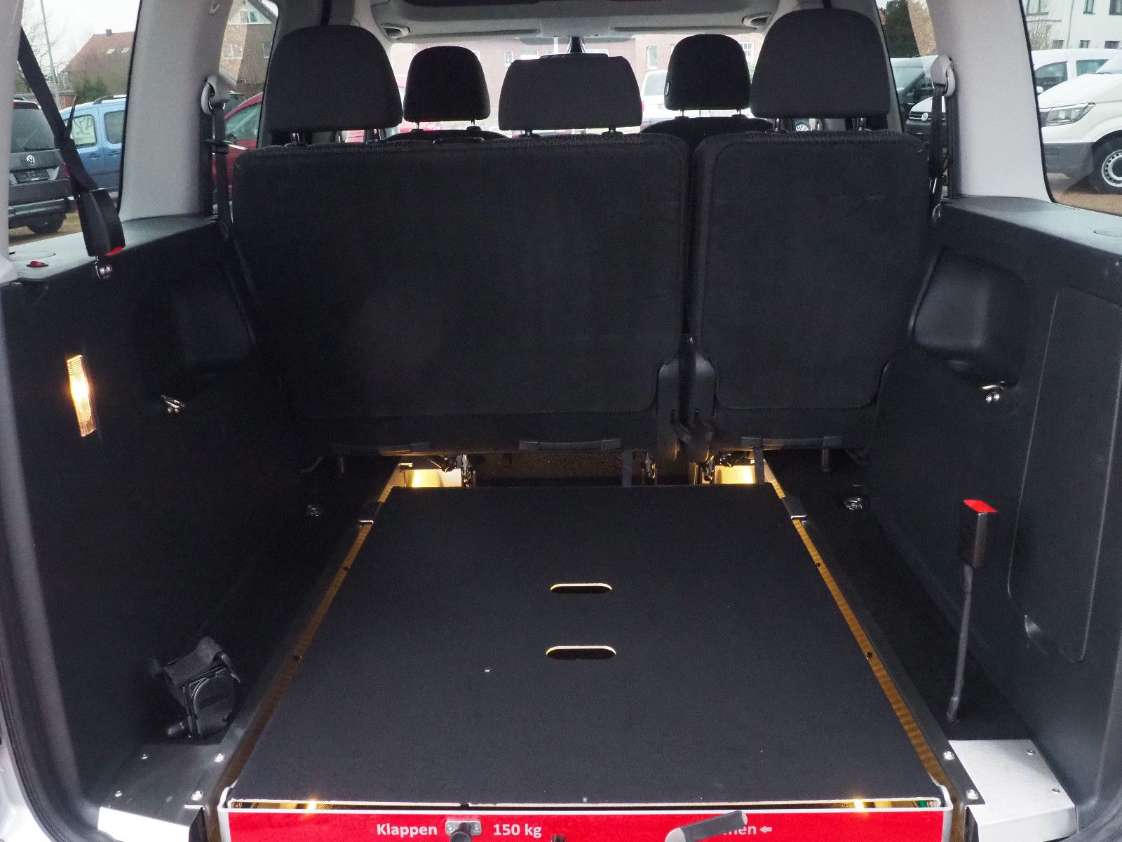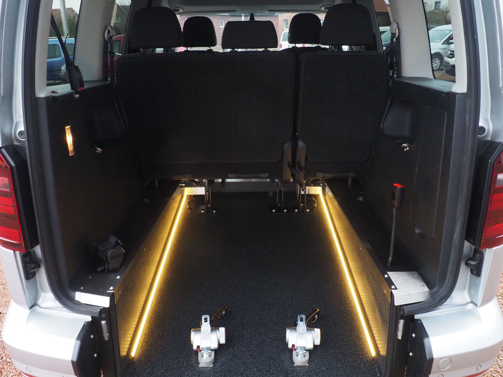 VW CADDY Automatik mit Heckausschnitt und mit einer nach vorn umlegbaren Rollstuhlrampe/Wenderampe! Umbau neu durchgeführt, LED Bodenbeleuchtung! Die Rampe lässt sich bei Nichtgebrauch vollständig nach vorne umlegen so das wieder ein ebener Ladeboden entsteht.