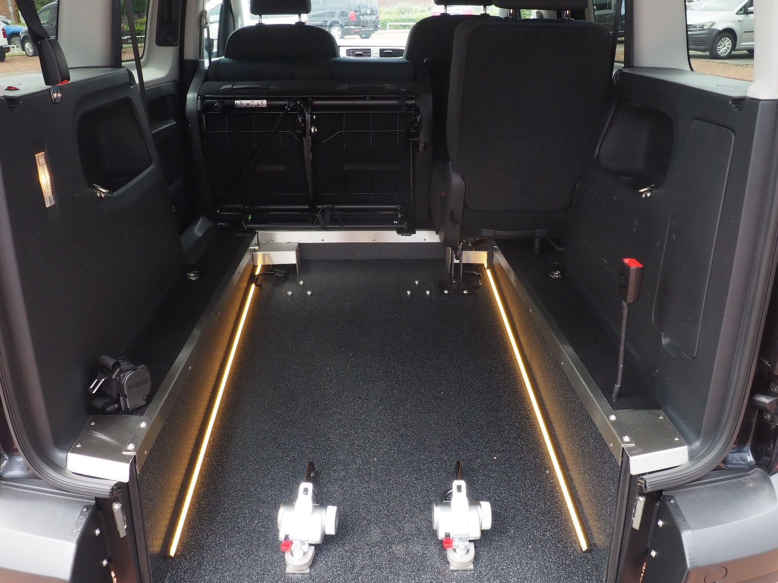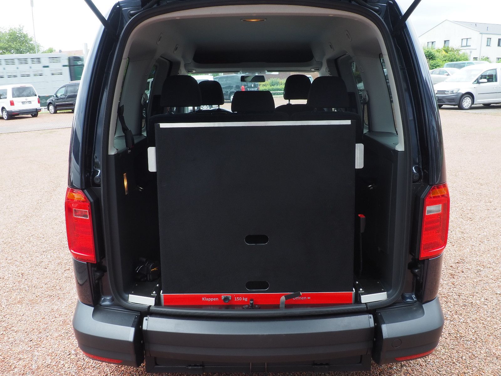 VW CADDY mit Heckausschnitt und mit einer nach vorn umlegbaren Rollstuhlrampe! Die Rampe lässt sich bei Nichtgebrauch vollständig nach vorne umlegen so das wieder ein ebener Ladeboden entsteht.
