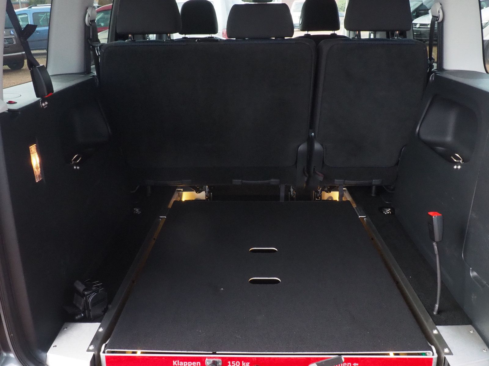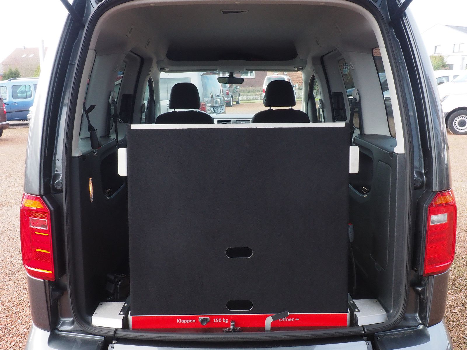 VW CADDY mit einer nach vorn umlegbaren Rollstuhlrampe! Die Rampe lässt sich bei Nichtgebrauch vollständig nach vorne umlegen so das wieder ein ebener Ladeboden entsteht.