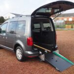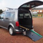 VW CADDY mit einer nach vorn umlegbaren Rollstuhlrampe! Die Rampe lässt sich bei Nichtgebrauch vollständig nach vorne umlegen so das wieder ein ebener Ladeboden entsteht.