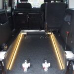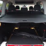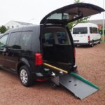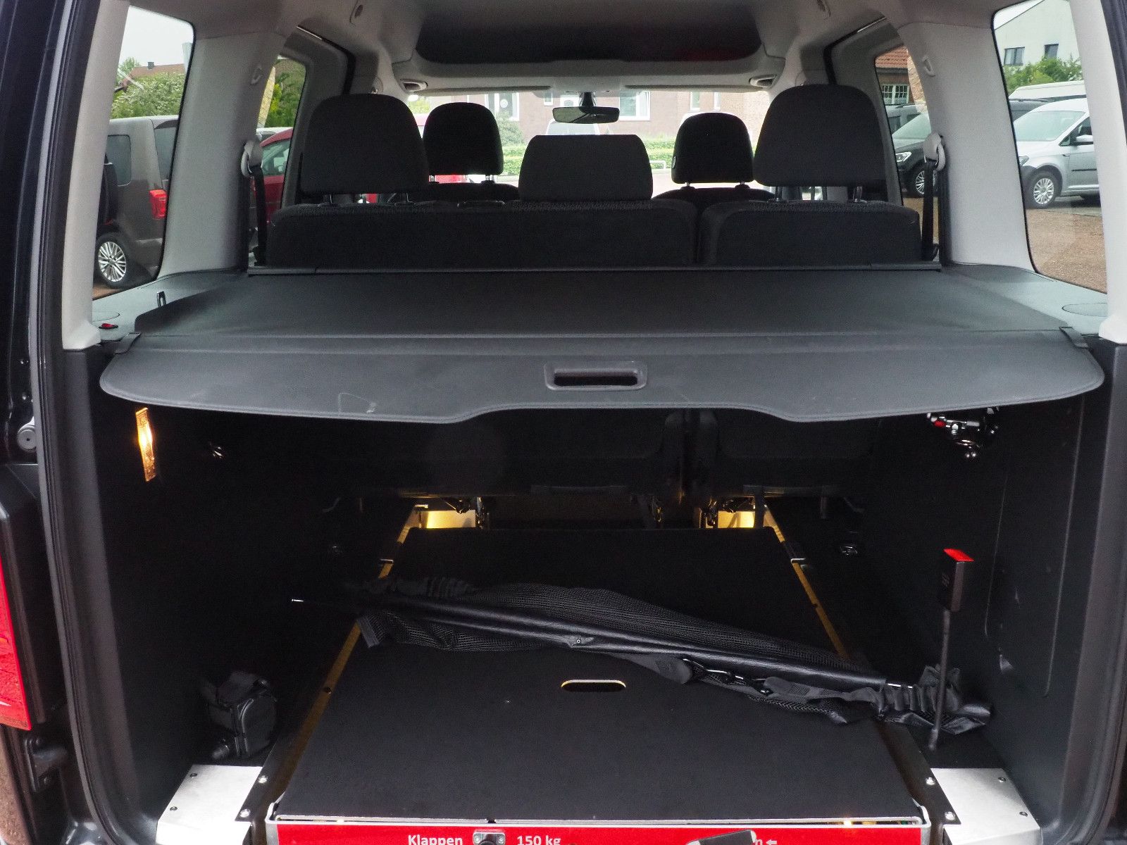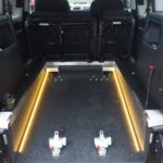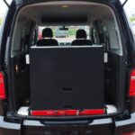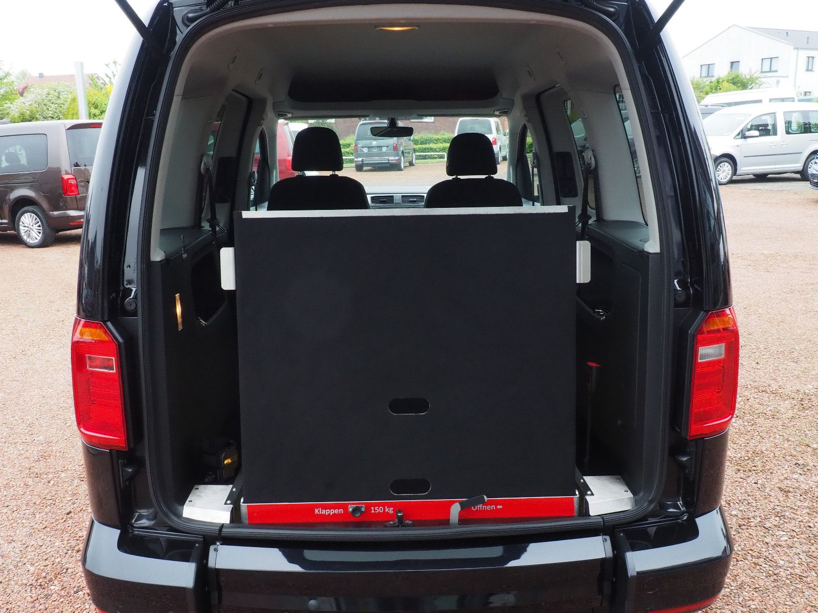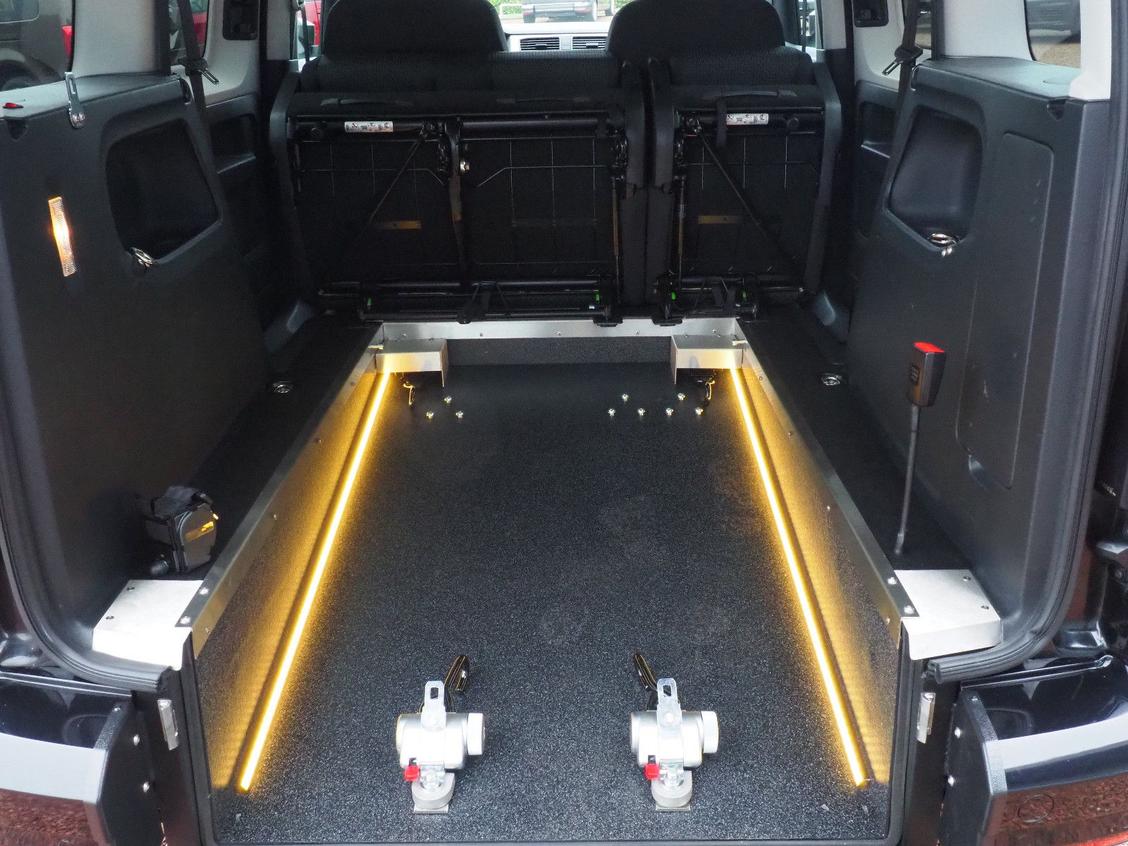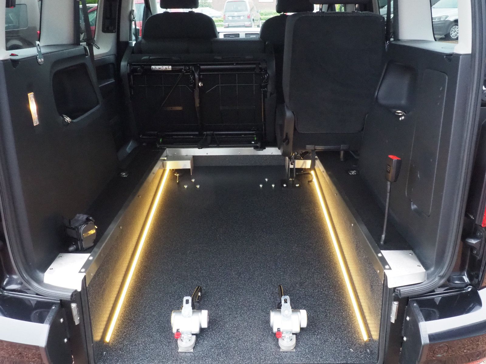 VW CADDY mit Heckausschnitt und mit einer nach vorn umlegbaren Rollstuhlrampe/Wenderampe! Umbau neu durchgeführt, LED Bodenbeleuchtung! Die Rampe lässt sich bei Nichtgebrauch vollständig nach vorne umlegen so das wieder ein ebener Ladeboden entsteht.
