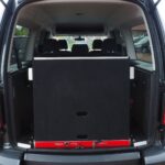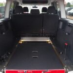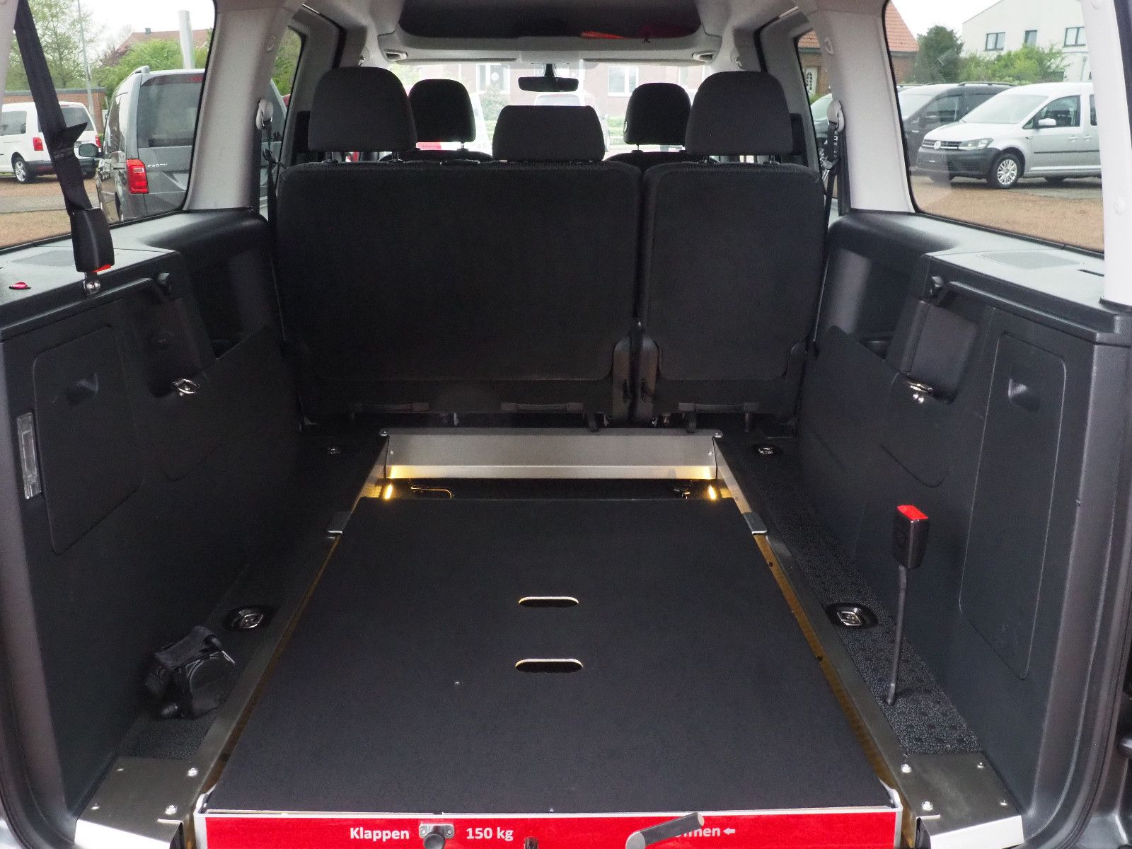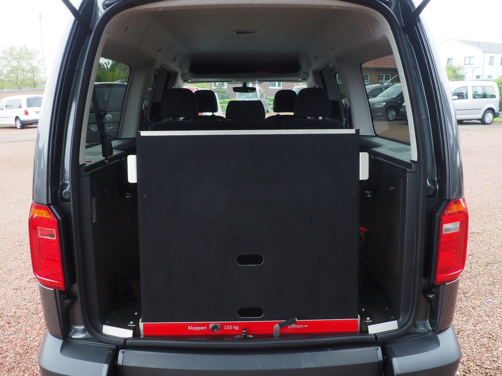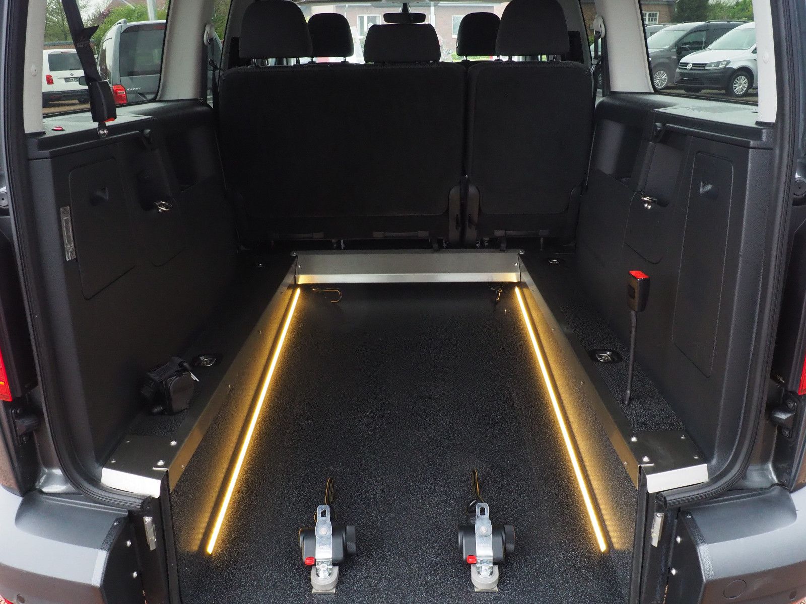 ( Fahrzeug 93) VW Caddy Maxi mit Heckausschnitt und klappbarer Rollstuhlrampe/Wenderampe! Umbau neu durchgeführt!! LED-Bodenbeleuchtung im Rollstuhlbereich. Die Rampe lässt sich bei Nichtgebrauch nach vorne umlegen so das wieder ein ebener Ladeboden entsteht.