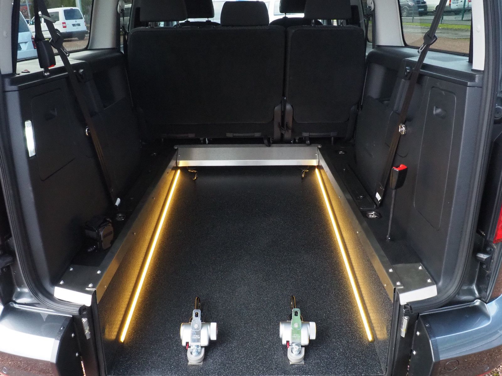 Sonderausstattung: VW Caddy Maxi Automatik mit klappbarer Rollstuhlrampe/Wenderampe. Die Rampe lässt sich bei Nichtgebrauch nach vorne umlegen so das wieder ein ebener Ladeboden entsteht. Umbau neu durchgeführt! LED-Bodenbeleuchtung im Ausschnittbereich!