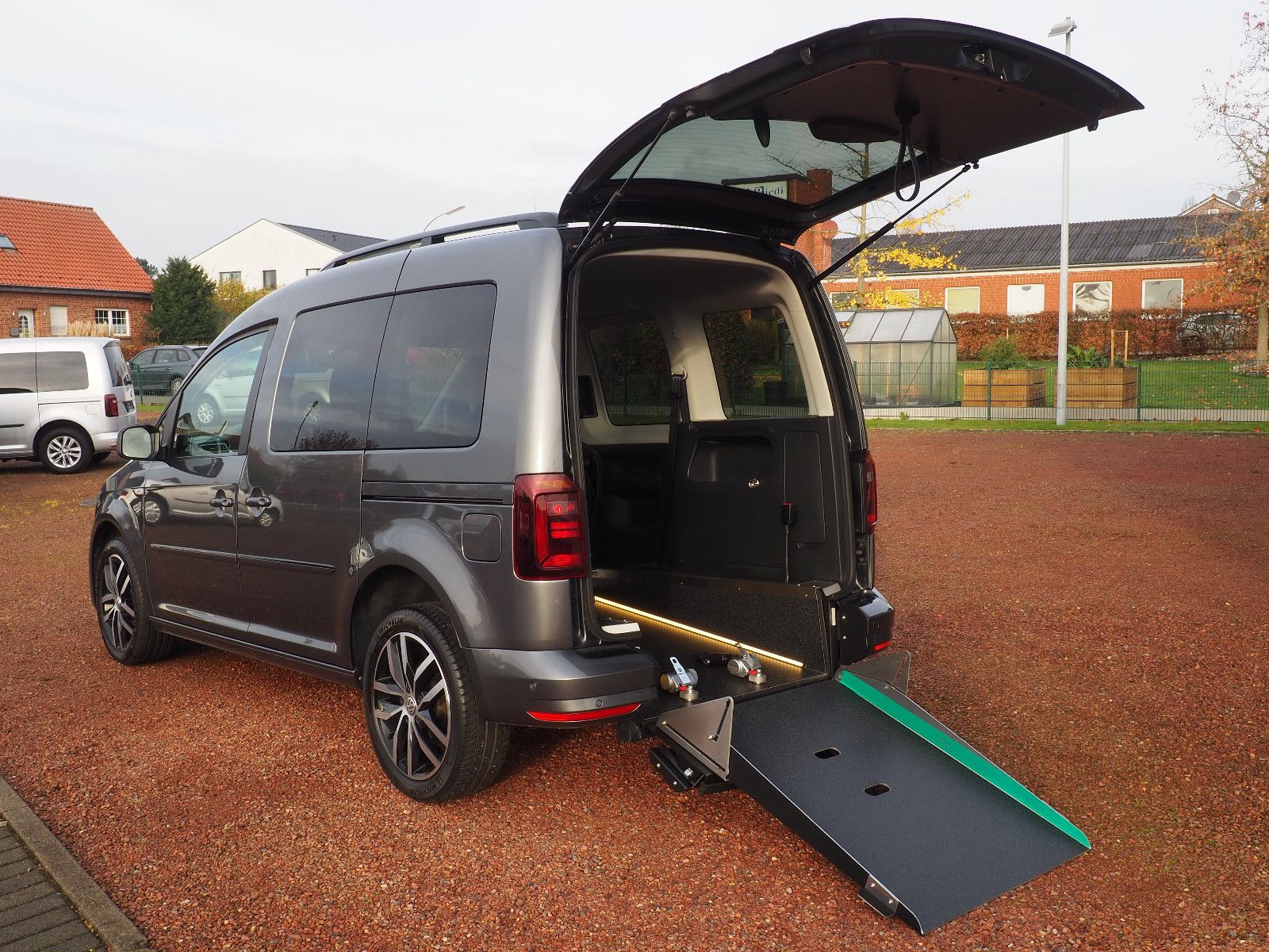 Sonderausstattung: VW Caddy Sondermodell Edition 35 Automatik, Bi-Xenon, Standheizung, Kamera, mit Heckausschnitt und einer nach vorn umlegbaren Rollstuhlrampe Easy-Flex. Rollstuhlgerecht! LED Bodenbeleuchtung im Ausschnittbereich, Umbau neu durchgeführt. Die Rampe lässt sich bei Nichtgebrauch vollständig nach vorne umlegen so das wieder ein ebener Ladeboden entsteht. Der Rollstuhl wird mit 2 elektrischen Gurten vorne und 2 Spannretraktoren hinten ordnungsgemäß fixiert, zusätzlich wird die zu befördernde Person im Rollstuhl sitzend mit einem Schulter/Beckengurt gesichert. Bei Rollstuhltransport verbleiben je nach Rollstuhlgröße bis zu 3 vollwertige Sitzplätze, ohne Rollstuhltransport als normaler 5 Sitzer nutzbar. Einfahrbreite/Rampenbreite 80 cm, Einfahrhöhe 143 cm, 1 Vorbesitzer, unfallfrei, lückenlos VW Scheckheft gepflegt! Fahrzeugnummer 26